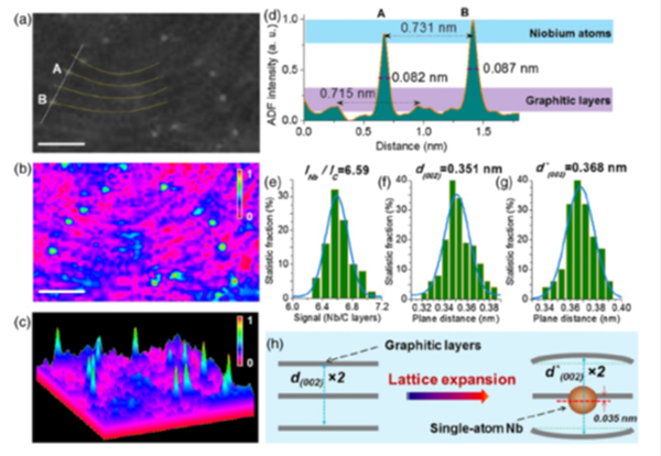 图1 高密度单原子铌镶嵌在石墨层基体中STEM-ADF分析