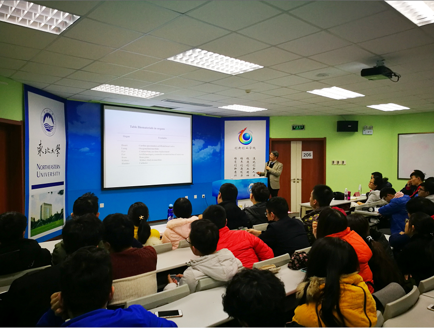 新家教授首先向同学们介绍了当下各国普遍面临的社会问题——人口老龄化,以及导致老人死亡的三大疾病杀手,并由此引出生物医学材料在治疗疾病方面做出的巨大贡献。紧接着,新家教授讲述生物医学材料的历史背景及其在医疗器械方面的应用。最后,新家教授通过一系列的图表及数据,向同学们较为全面地展示了各种金属及其合金的特殊性质,以及这些性质在生物医学方面的应用。其中他重点举例介绍了铬、钴、锰、钛四种金属及其合金,贴合其研究方向,与我们分享了他的先进研究成果。