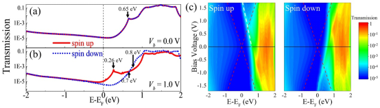 图2.0 V(a)和1V(b)偏压下的自旋电子透射谱,不同能量和偏压下的自旋电子透射图(c)。