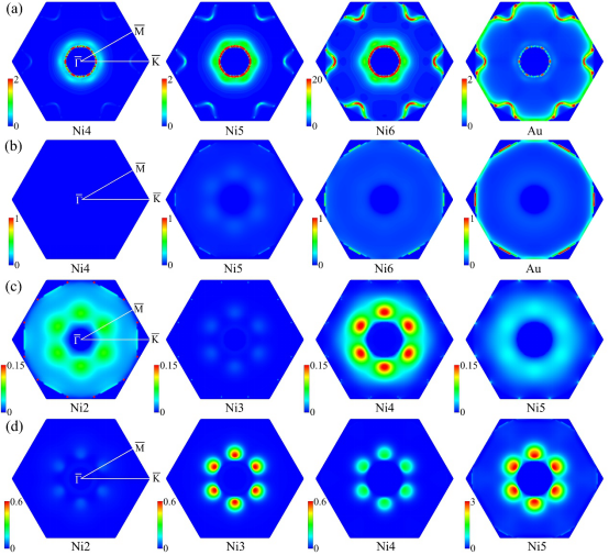 图3.k分辨的自旋电子态密度。能量为0.26 eV的界面处自旋向上(a)和自旋向下(b);能量为0.8 eV的中间层自旋向上(c)和自旋向下(d)。