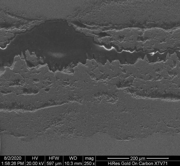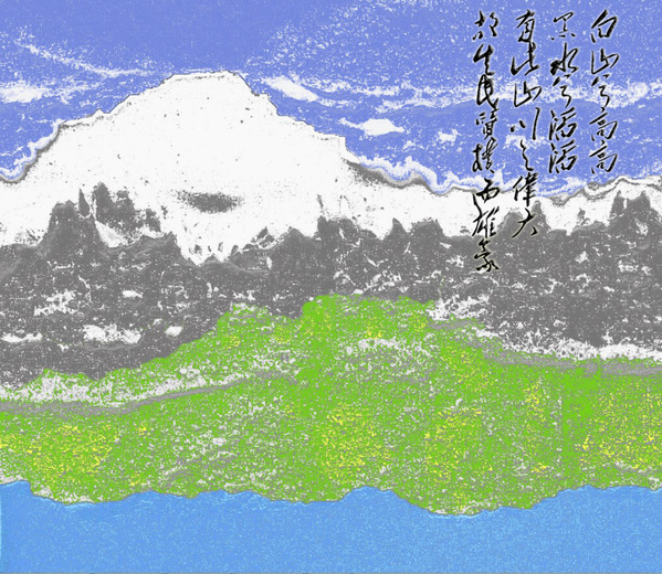 研究生贾泽伟、单文超、曾林林同学的《白山黑水》,原图为436不锈钢在高温同步差热分析仪中经1050摄氏度高温氧化4h后的氧化层SEM断面形貌。艺术图是利用Photoshop快速选择和色彩范围选择将原SEM图分割为多个图层,然后利用色阶、色相/饱和度和添加蒙版等调整各图层的颜色,最终得到由雪山、草地和河流组成的白山黑水图,彰显了材料学子对东北大学的深情。