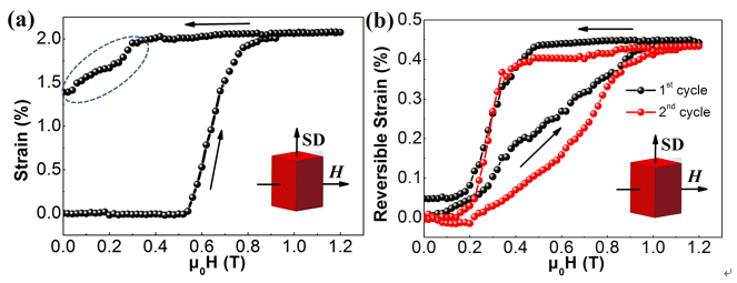 图2 定向凝固Ni50Mn28.5Ga21.5合金的磁感生应变。(a)单程磁感生应变;(b)可逆磁感生应变