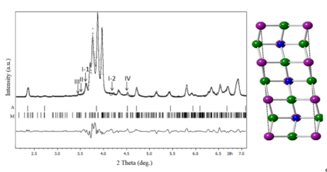 图1 Ni50Mn36In14合金同步辐射粉末衍射花样与基于超空间理论的全谱拟合图谱及晶体结构示意图
