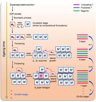 图2. Hcp合金内TCP盘状析出相形核与长大的结构演变路径示意图