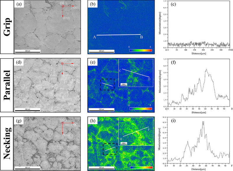 图4 在加载方向上对握把、平行和颈缩部分的 EBSD 结果。(a),(d),(g)带状对比(BC)图;(b),(e),(h)核平均取向差(KAM)图;(c),(f),(i)沿 AB,CD,EF 线的累积取向差分布图。