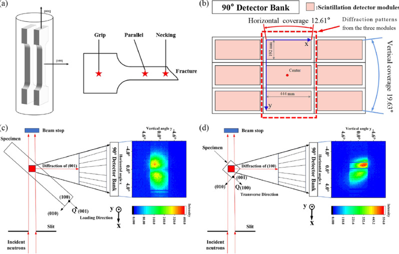 图2 (a)拉伸试样的加工以及在断裂试样上选择的测试位置;(b)从 GPPD 中角检测器中选择用于提取衍射数据的检测器模块;(c),(d)用于获得加载方向和横向方向衍射图案的中子衍射测量实验装置。