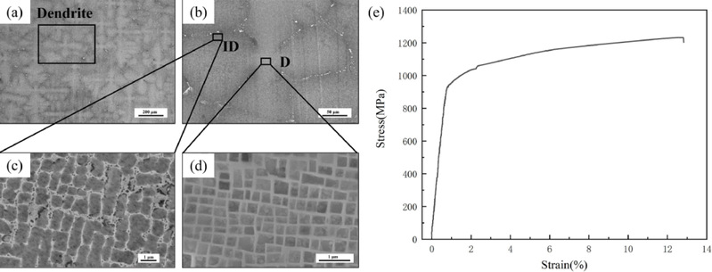图3 (a)枝晶形态,可清晰区分枝晶和枝晶间区域;(b)背散射电子显微图,显示枝晶(浅灰色十字)和枝晶间区域(深灰色区域);(c),(d)枝晶间(ID)区域和枝晶(D)区域的 γ/γ' 微观结构;(e)760°C 下的真应力 - 应变曲线。