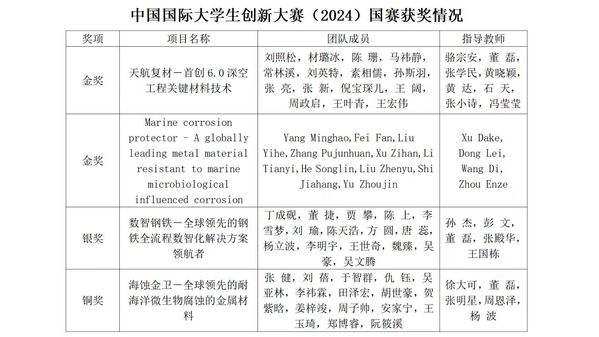 自本届大赛启动以来,乐动体育app 在学校领导及创新创业乐动体育app 指导下,精心组织、动员、培育。在7月举办的辽宁省大学生创新大赛(2024)中,东大材料荣获金奖3项、银奖3项。最终共有4个项目入围全国总决赛,其中3个项目参加全国总决赛现场比赛。经过各赛道的激烈角逐,《天航复材——首创6.0深空工程关键材料技术》获高教主赛道研究生创意组金奖;《Marine corrosion protector - A globally leading metal material resista》获得高教主赛道国际项目金奖,首次实现了东北大学在国际赛道上金奖“零”的突破。