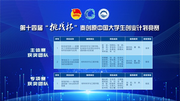 10月29日至11月2日,第十四届“挑战杯”中国大学生创业计划竞赛在西安交通大学举行,经过校级初赛、省级复赛,共有来自412所国内高校和14所国际高校的839个项目进入全国决赛终评。东大材料在本届大赛中荣获全国金奖1项、银奖1项、铜奖1项,刷新该项竞赛历史最好成绩,助力东北大学以总积分第六名的优异成绩捧得“优胜杯”!