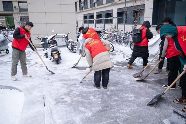 沈阳初雪后,志愿者们在新二舍、知行楼和中心食堂等师生密集区域集合,手持铁锹、雪铲等工具,投入到铲冰除雪工作中,清理积雪的同时,提醒来往师生注意安全,做好防寒保暖。经过三个多小时的清扫,志愿者们成功清理多处积雪,确保校园道路畅通无阻,保障师生们的出行安全。