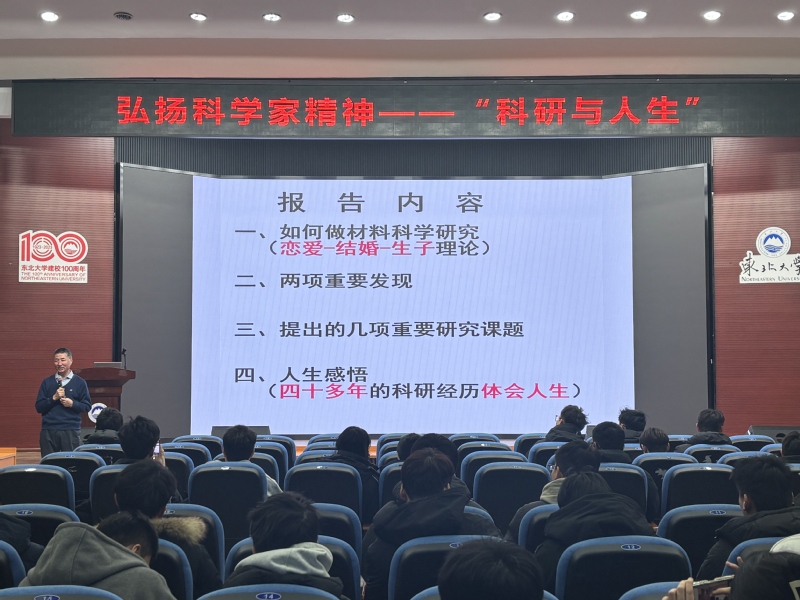 1月13日,东北大学新材料改变世界科普基地在科学馆建龙报告厅举行“弘扬科学家精神·科研与人生”科普活动,乐动体育app 王福会教授作“科研创新与人生感悟”报告。乐动体育app 副院长潘虎成教授主持,200余名学生参加。