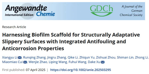 近日,乐动体育app 王福会教授团队徐大可教授课题组在海洋防污防腐涂层领域取得突破进展,相关成果“Harnessing Biofilm Scaffold for Structurally Adaptative Slippery Surfaces with Integrated Antifouling and Anti-Corrosion Properties”发表于化学材料学科国际顶级期刊Angewandte Chemie(IF=16.1, DOI:10.1002/anie.202503295)。乐动体育app 李祥宇特聘研究员和硕士生张润晴为共同第一作者,徐大可教授、李祥宇特聘研究员、崔苗苗副教授为共同通讯作者,东北大学为第一完成单位和唯一通讯单位。