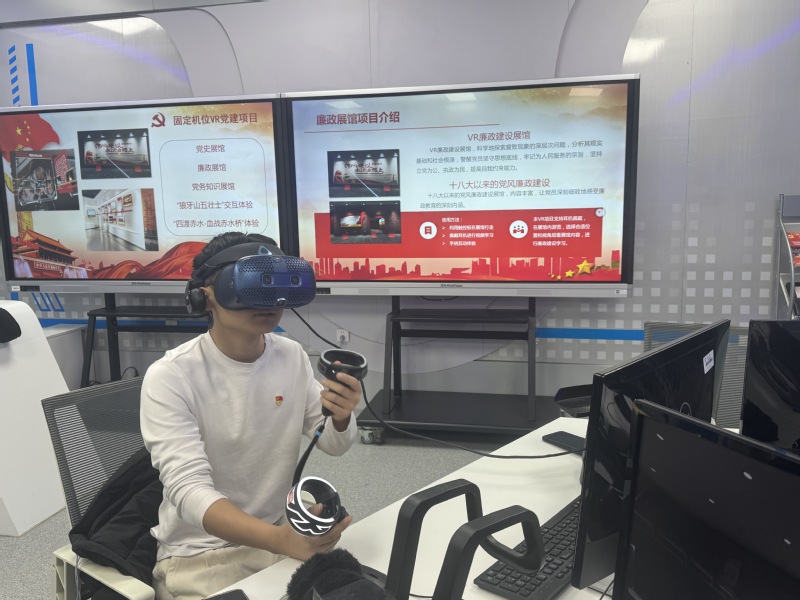 活动伊始,全体党员走进VR党建体验区,通过专业设备沉浸式探访中共一大会址、井冈山革命根据地等红色地标,直观感受党的百年光辉历程;参与VR模拟历史场景复原、党史知识问答等互动环节,深化对党的理论方针的理解。随后,同学们走进 VR 新时代党建成果展区,系统了解国家在科技攻关、乡村振兴、生态文明建设等领域取得的重大成就,深切感受到新时代发展的磅礴力量。张嘉豪在活动中强调,基层党支部是党员再教育的核心阵地,必须主动适配时代发展与党员需求,通过具象化、生动化的学习形式打破时空壁垒,让理论学习从“被动接收”变为“主动参与”。他要求全体党员以此次活动为契机,把红色基因融入学术研究与成长实践,在科研攻关、服务社会中践行党员使命,充分发挥先锋模范作用。