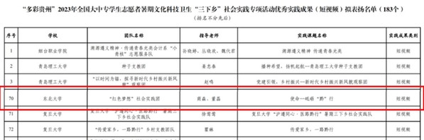 2月20日,在2023年全国大中专学生志愿者暑期文化科技卫生“三下乡”社会实践专项活动优秀实践成果刚刚公布的表扬名单中,由我院董磊、商淼老师指导,硕士党员所组建的东北大学红色梦想社会实践团制作的《使命一一砥砺“黔”行》短视频,获评优秀实践成果。