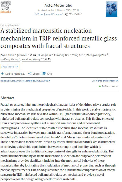 该研究不仅拓展了对TRIP强化非晶复合材料中分形结构的基础认知,深化了对其变形机制的理解,同时为高性能复合材料的设计提供了新的理论支撑。上述研究得到国家重点研发计划和国家自然科学基金项目的支持。