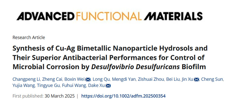 近日,东北大学材料科学与工程乐动体育app 王福会教授团队徐大可教授课题组和中国科乐动体育app 金属研究所许进研究员团队在《Advanced Functional Materials》上发表了题为“Synthesis of Cu-Ag Bimetallic Nanoparticle Hydrosols and Their Superior Antibacterial Performances for Control of Microbial Corrosion by Desulfovibrio desulfuricans Biofilm”的研究论文。乐动体育app-乐动体育平台 硕士生李昌鹏和中国科乐动体育app 金属研究所博士生才政为共同第一作者,通讯作者为徐大可教授、许进研究员和韦博鑫副研究员。