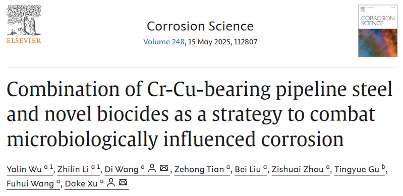 近日,材料乐动体育app 王福会教授团队徐大可教授课题组本科生在国际腐蚀领域顶级期刊Corrosion Science(中科院一区,影响因子7.4)上发表了题为《Combination of Cr-Cu-bearing pipeline steel and novel biocides as a strategy to combat microbiologically influenced corrosion》的研究论文,材料科学与工程专业2022级本科生吴亚林与李祉霖为共同第一作者,徐大可教授与王迪副教授为共同通讯作者。