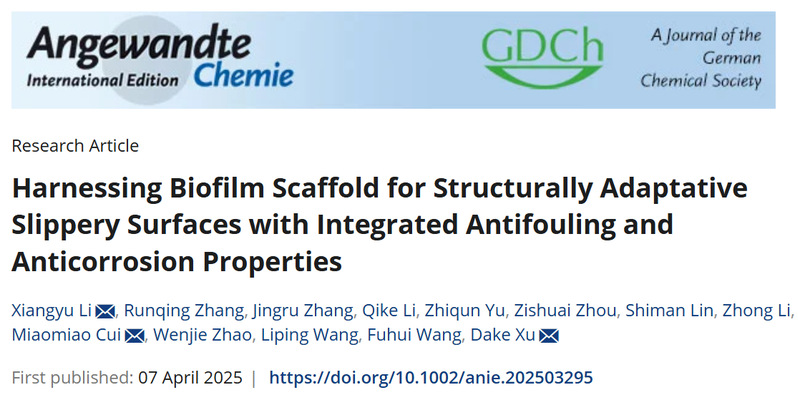 近日,乐动体育app 王福会教授团队徐大可教授课题组在海洋防污防腐涂层领域取得突破进展,相关成果“Harnessing Biofilm Scaffold for Structurally Adaptative Slippery Surfaces with Integrated Antifouling and Anti-Corrosion Properties”发表于化学材料学科国际顶级期刊Angewandte Chemie(IF=16.1, DOI:10.1002/anie.202503295)。乐动体育app 李祥宇特聘研究员和硕士生张润晴为共同第一作者,徐大可教授、李祥宇特聘研究员、崔苗苗副教授为共同通讯作者,东北大学为第一完成单位和唯一通讯单位。
