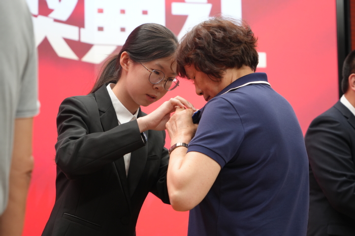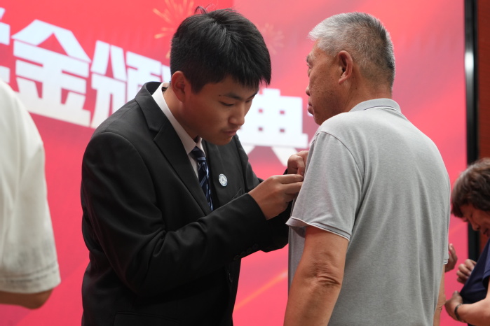 在颁奖仪式上,获奖学生为颁奖的领导和校友佩戴了乐动体育app 院徽。材料成型及控制工程专业2022级本科生袁牧、2023级本科生刘馨语作为获奖学生代表发言,分享了自己的成长经历,并表示将铭记这份荣誉,传承“自强不息、知行合一”的校训精神,弘扬“厚德为料,铸智成材”的院训品格,不负韶华,砥砺前行。