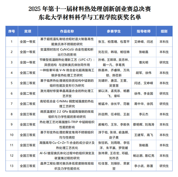 近日,2025年中国大学生机械工程创新创意大赛——第十一届材料热处理创新创业赛总决赛在西安理工大学金花校区落下帷幕。本次大赛由中国机械工程学会主办,中国机械工程学会热处理分会和西安理工大学联合承办,东北大学乐动体育app 共有13件作品晋级全国总决赛,荣获全国一等奖3项、二等奖4项、三等奖6项。东北大学入围全国总决赛的队伍全部获奖。